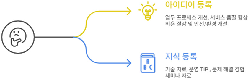 아이디어 지식센터는 업무개선 아이디어와 실무 지식을 간편하게 등록하고 전사적으로 공유할 수 있는 참여형 제안제도 입니다.